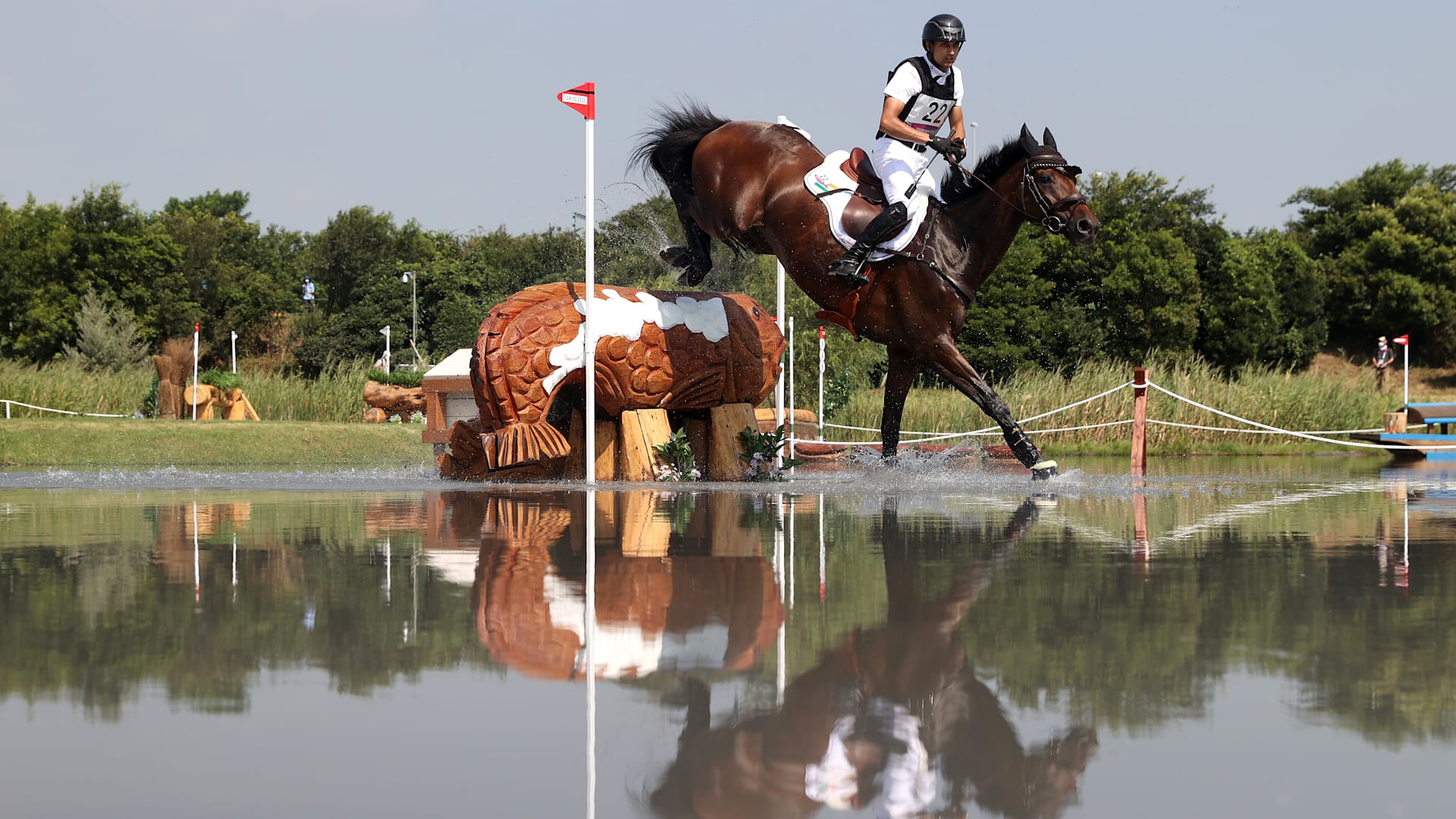 Cross country water jump horse falls.